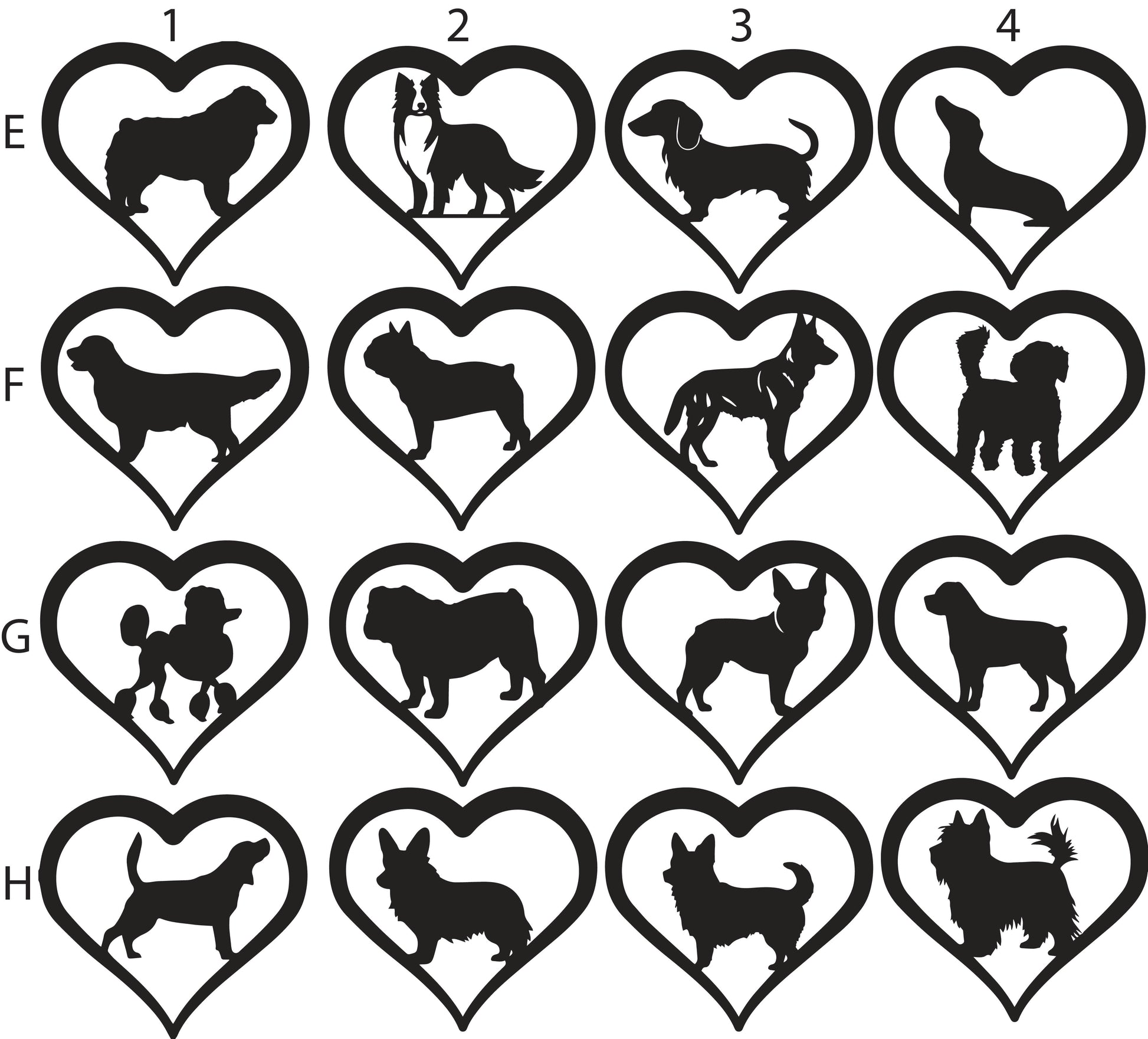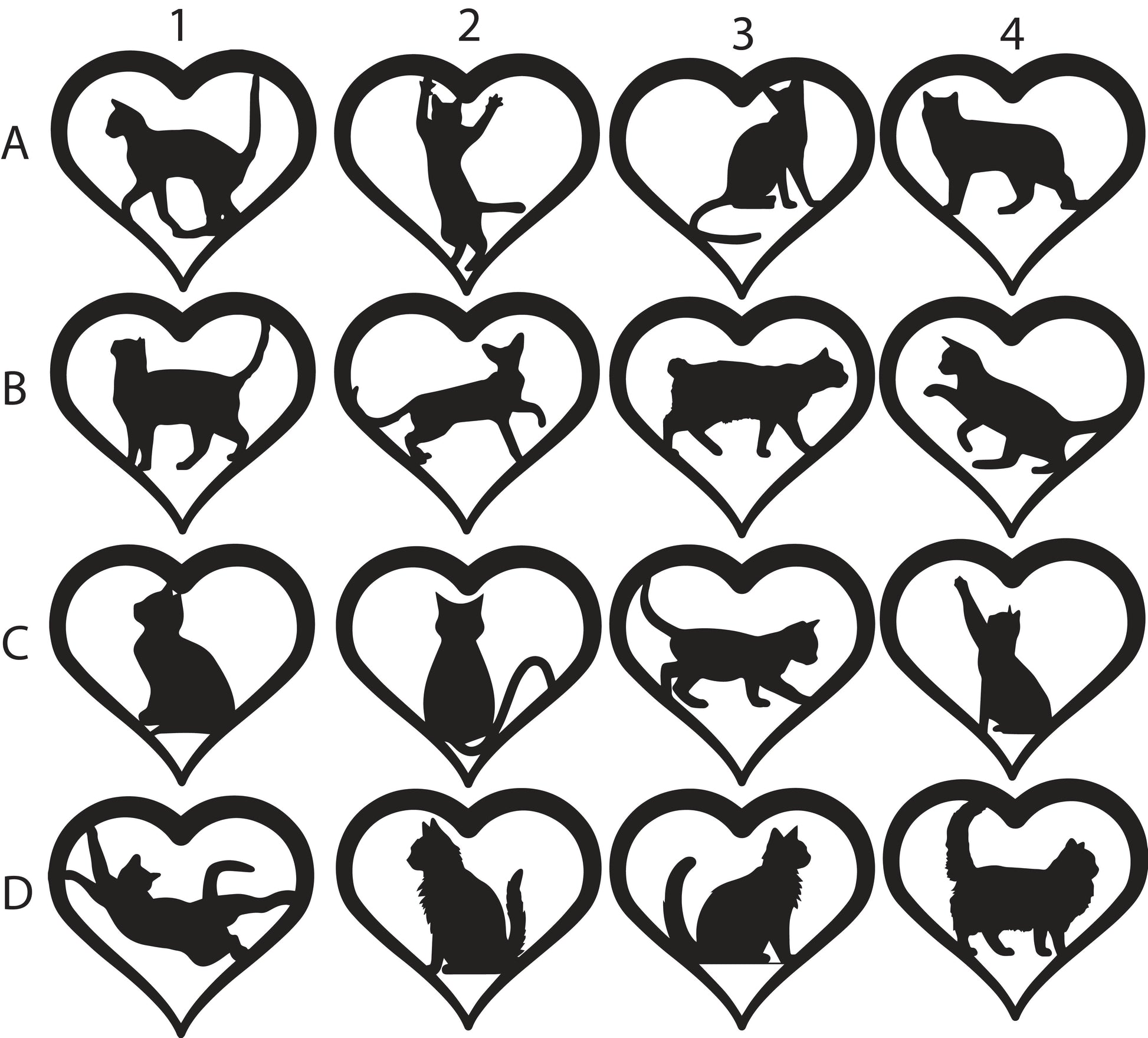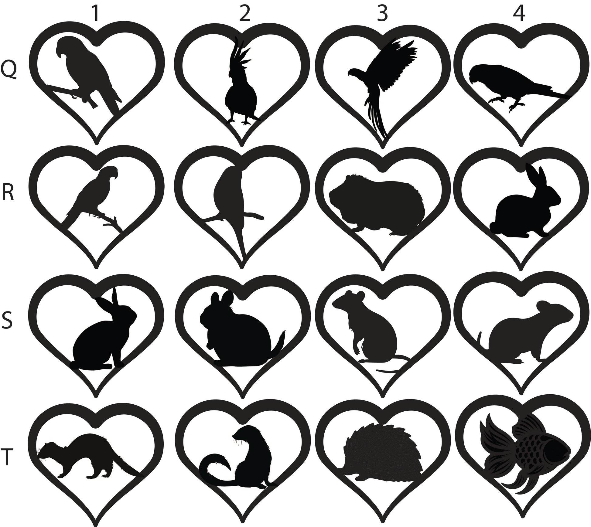 To order, write the letter/number combination of your desired pets into the provided spaces. Heart 1 will be at the top of your suncatcher and Heart 4 at the bottom. Each animal selection adds $25.