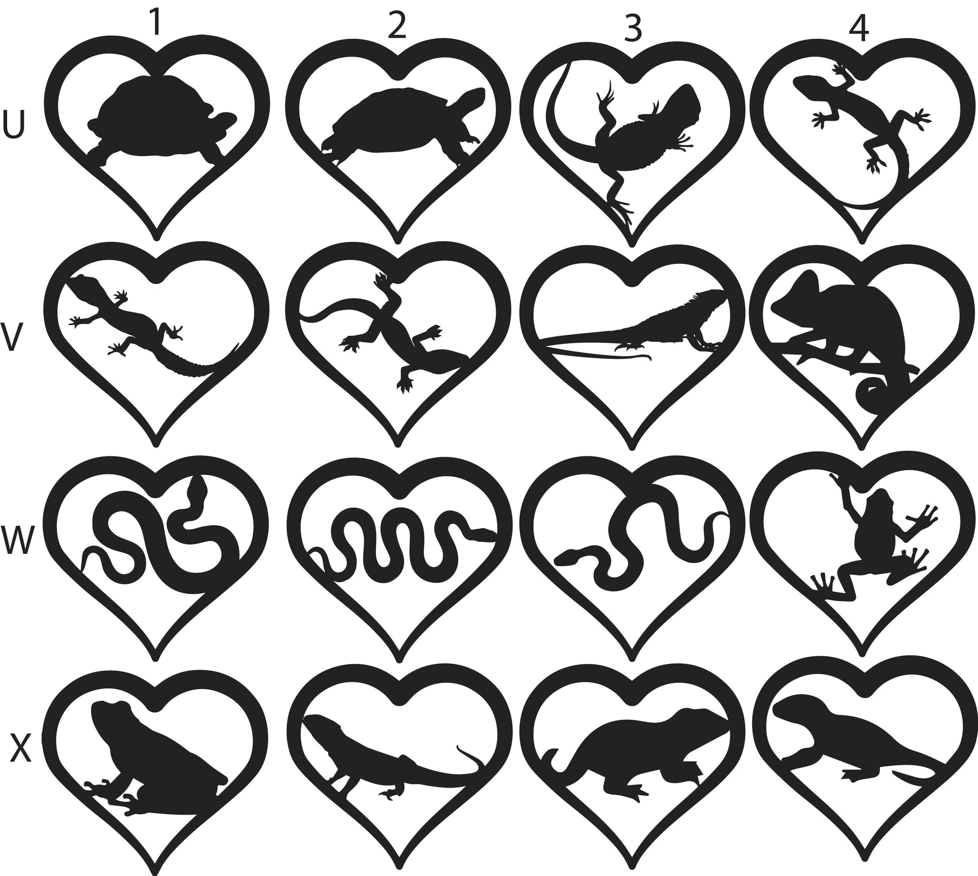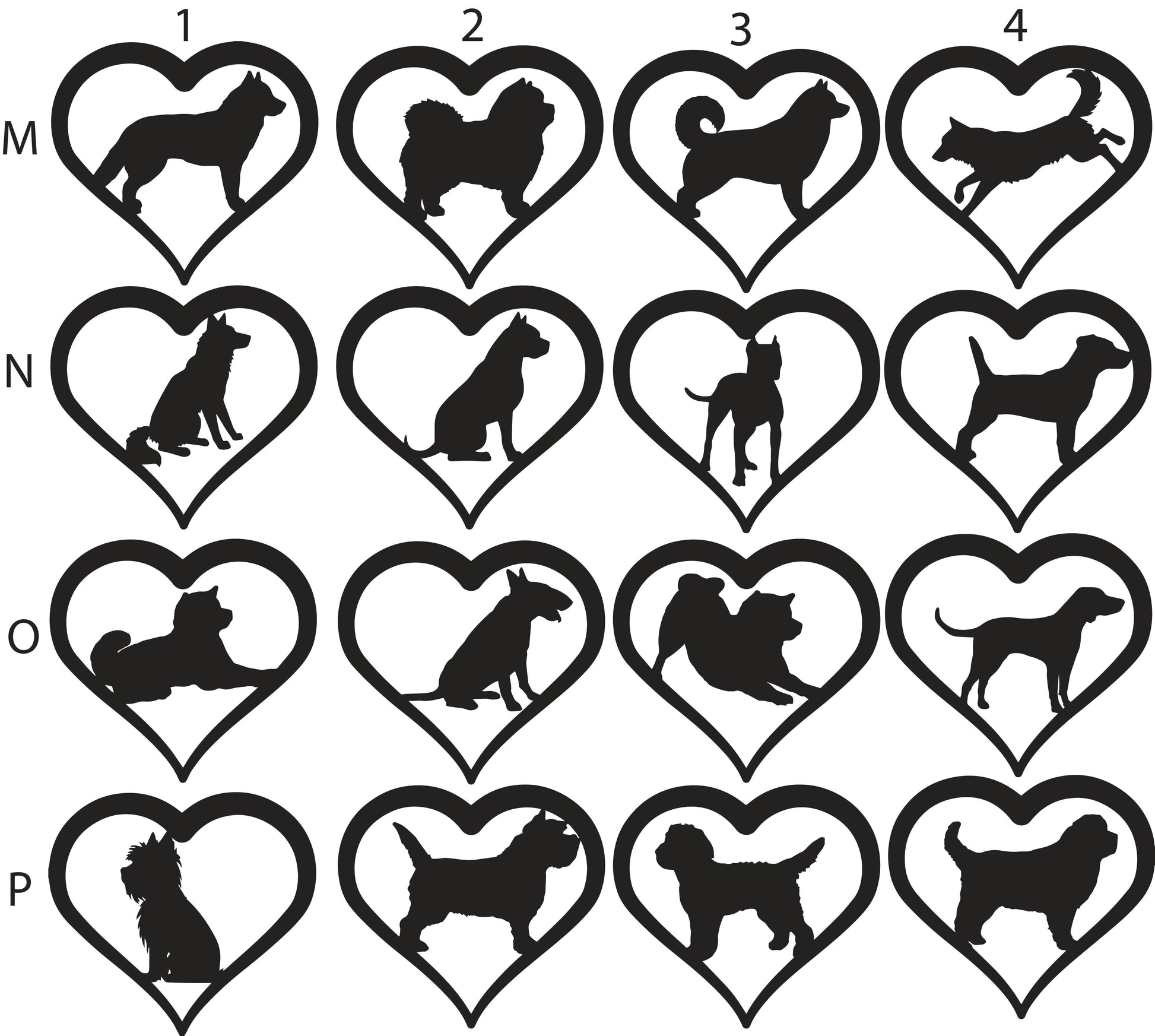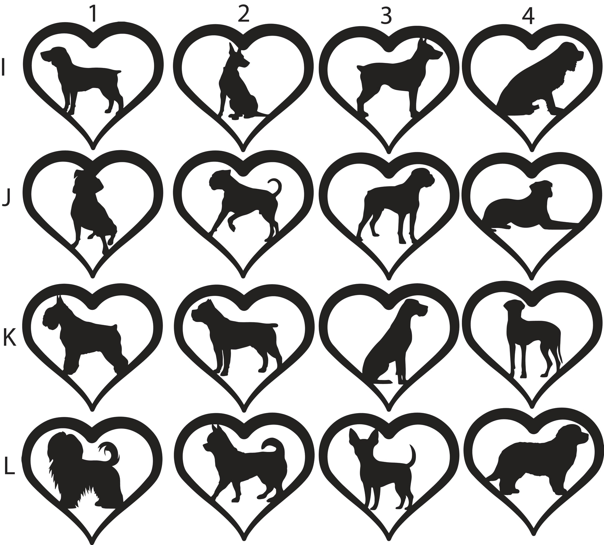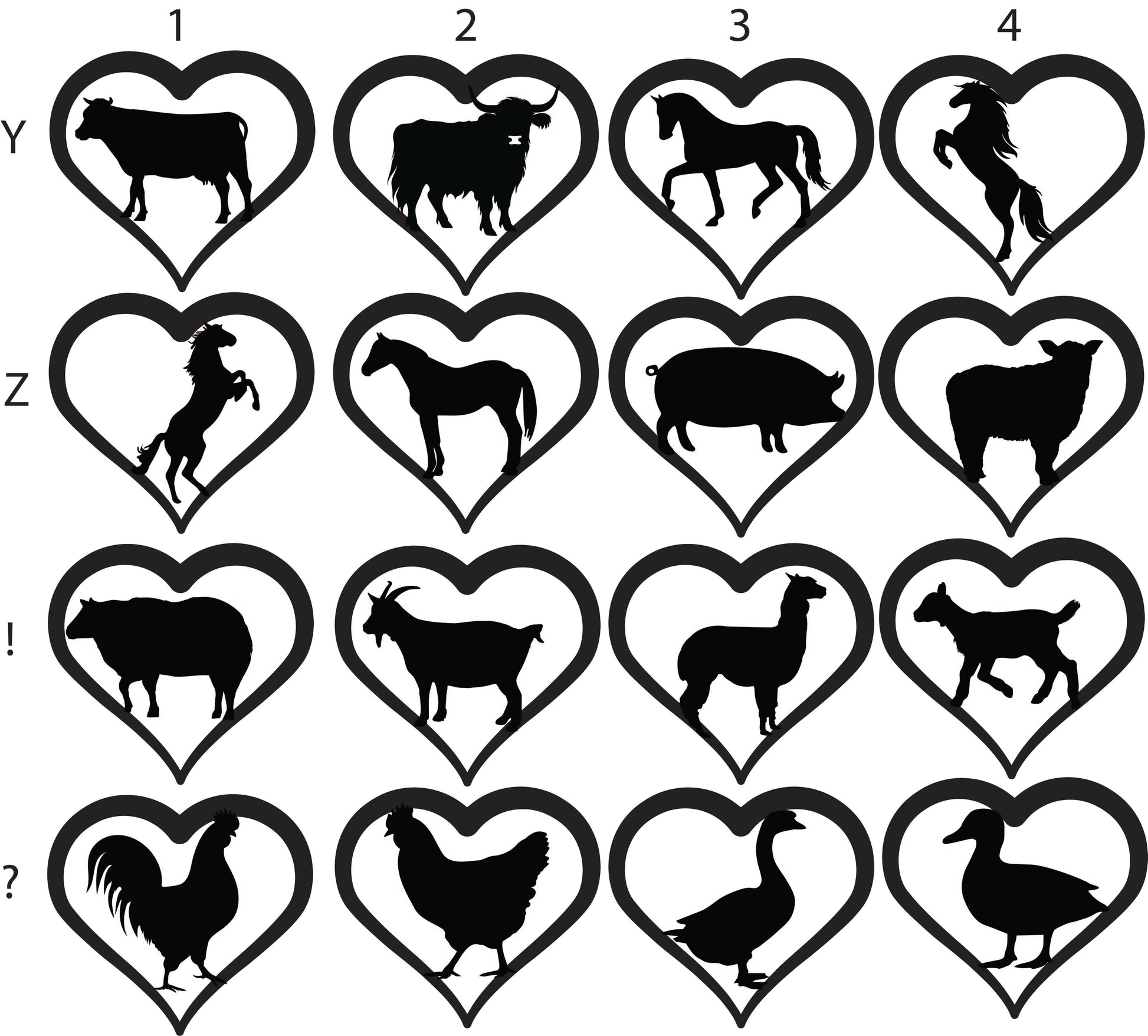 To order, write the letter/number combination of your desired pets into the provided spaces. Heart 1 will be at the top of your suncatcher and Heart 4 at the bottom. Each animal selection adds $25.