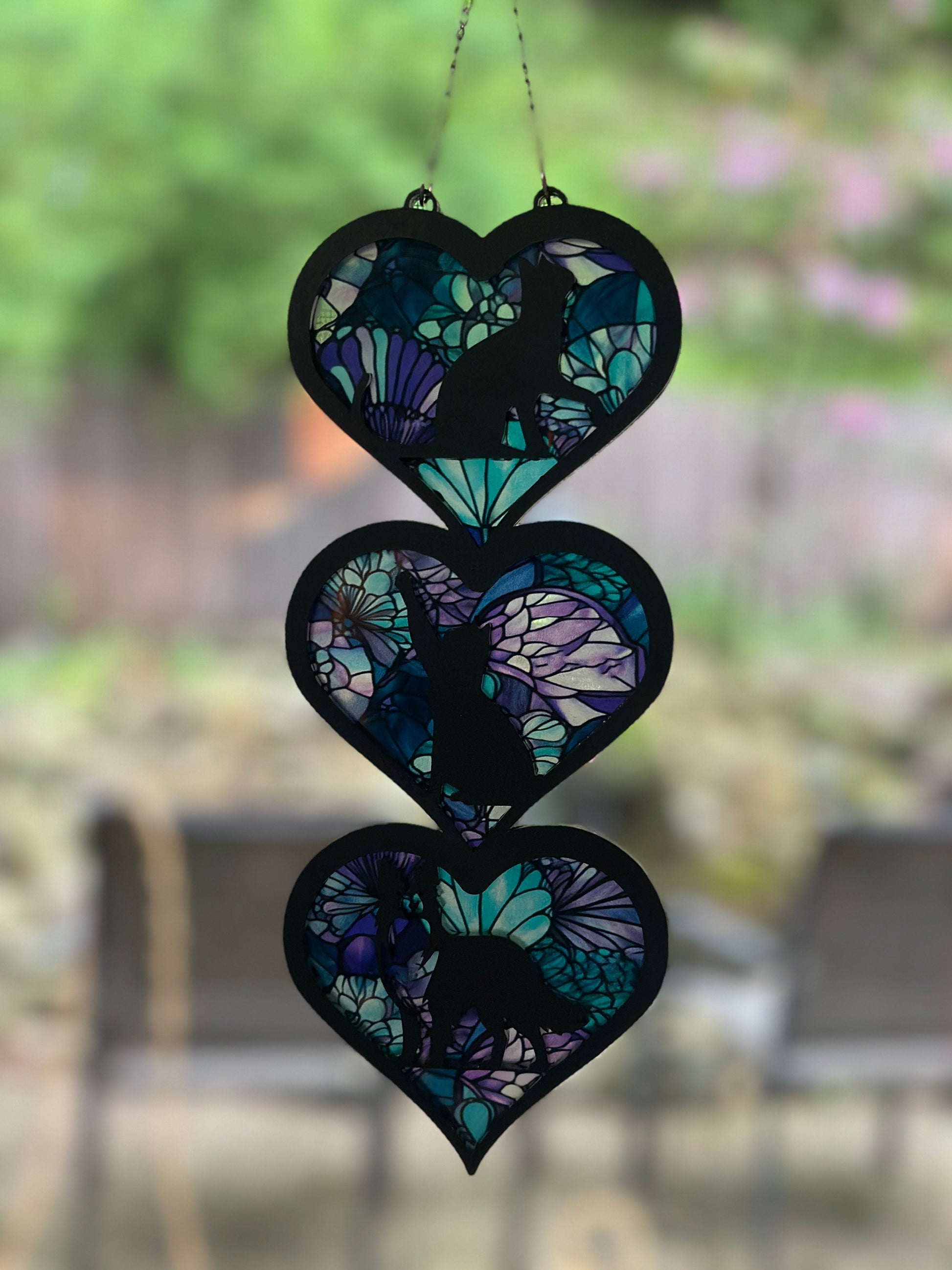 Suncatchers are made of acrylic, with the outline featured on both sides to look its best on either side of the window! Each heart is 3 inches wide and 2.7 inches tall.